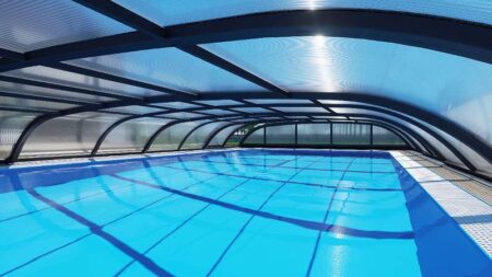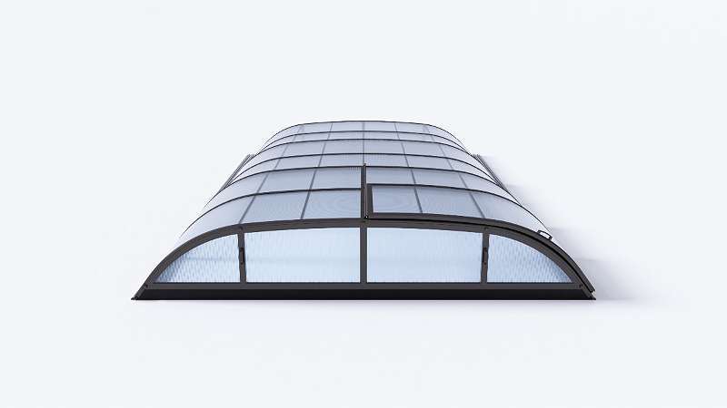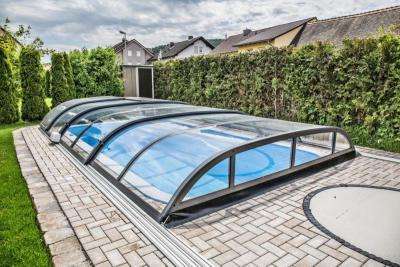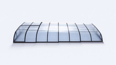 Ein echtes Highlight in Ihrem Garten. Die Schwimmbadüberdachung mit den flachen, begehbaren Laufschienen einer kompletten Verglasung aus klarem Polycarbonat, Seiteneingang im größten Modul, Position wählbar, abnehmbarer Vorderwand und Profilfarbe Anthrazit od. Elox-Silber.